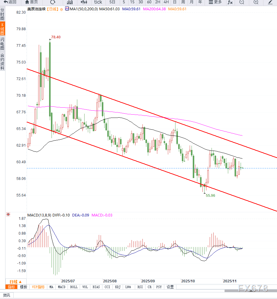 技术指标方面,RSI处于中性偏弱区域,未见明显反弹信号;MACD保持低位粘合,显示动能不足。关键支撑位仍在58.30美元附近,该区域若被有效跌破,将打开进一步下探空间;