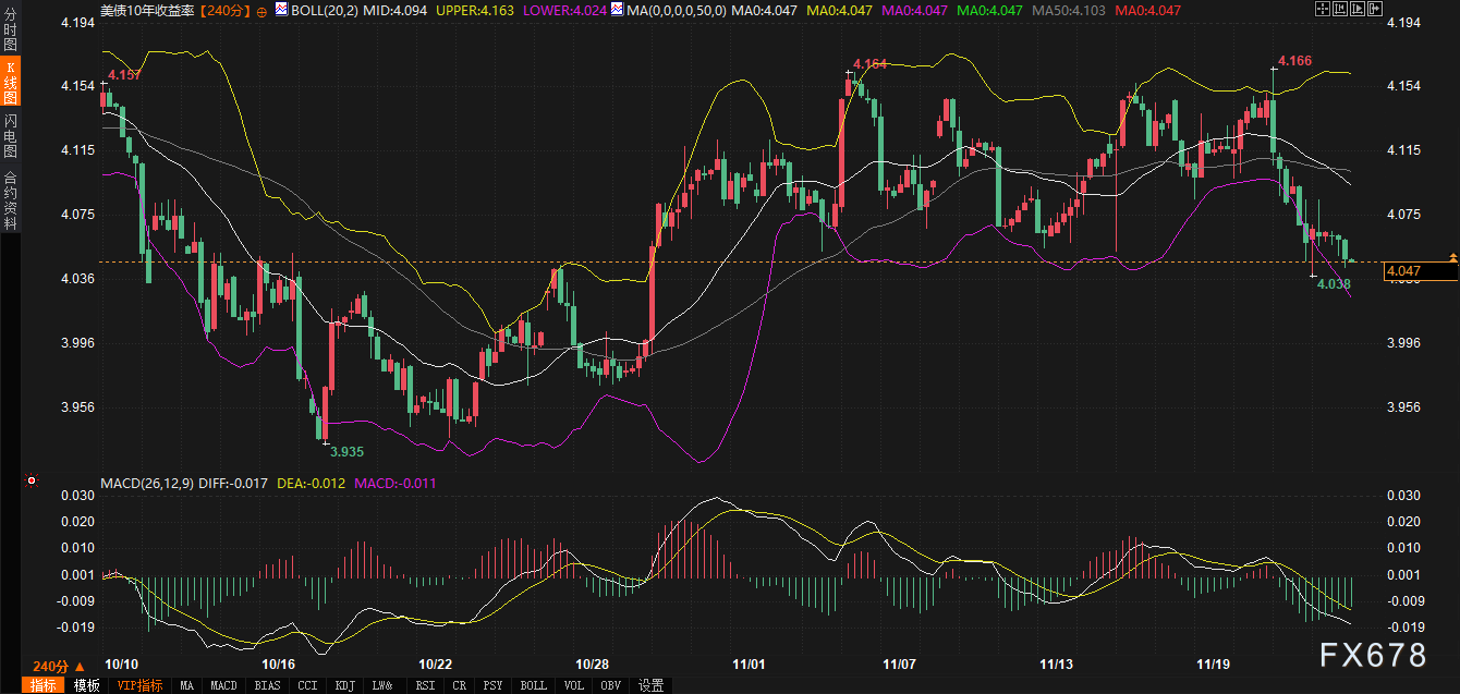 汇通财经APP讯——周一,美元指数窄幅震荡于100.10附近,日内微跌0.09%,延续上周五的疲软态势。同期,10年期美债收益率回落至4.05%,较前日下跌4.7个基点,触及布林带下轨支撑。市场交投清淡,日本因劳动感恩节休市加剧流动性短缺,美国国债期货成交量萎缩,12月合约仅成交41万手,波动区间收窄至113-05.5/113-10.5。这一格局显示,投资者在货币政策信号不明朗与全球债市波动加剧的背景下趋于谨慎。