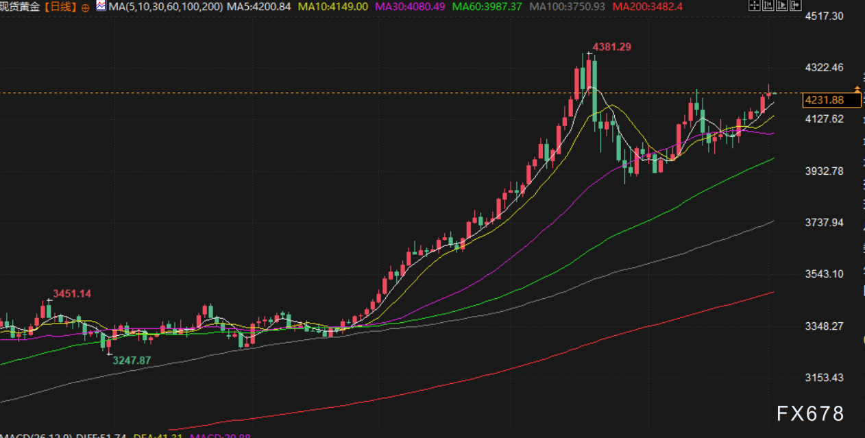 黄金价格周一升至六周以来最高水平,现货黄金上涨0.3%,报每盎司4241.27美元。白银价格表现更为强劲,上涨3.8%至每盎司58.57美元,并在盘中触及每盎司58.83美元的创纪录高位。今年以来,白银价格累计涨幅已超过100%。