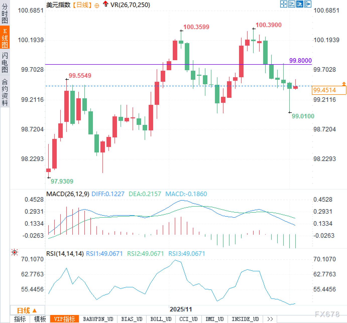 从日线看,美元指数在前期两次冲击100.35–100.39一带后未能有效突破,形成阶段性双顶形态,目前回落至99.45附近运行。99.80附近构成近期重要压力位,向下则关注前低99.01以及更早的97.93一线是否继续提供中期支撑。