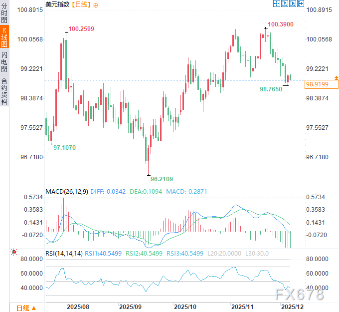 在“滞胀”阴影与“预防性降息”可能性的交织下,美元很可能告别单边强势或弱势,进入一个高波动、以区间震荡为主的新阶段。周五美元指数于98.95附近震荡,前一交易日一度触及近五周低点98.77。