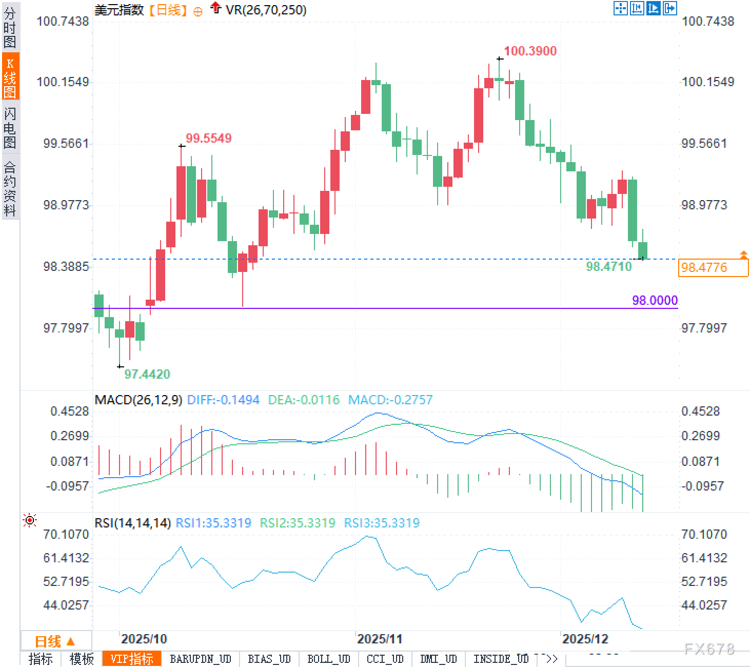 从指标层面来看,美元指数日线图上的MACD指标已呈现出空头排列态势,DIFF与DEA值均处于零轴下方,显示短期动能偏弱。相对强弱指数RSI则回落至35附近,处于中性偏弱区域,尚未触及超卖水平,表明若有进一步利空因素催化,下行空间在技术上仍未完全释放。然而,也需注意当前价位距离低点97.44已有一定缓冲空间,短线存在获利回补或逢低买盘介入的可能。
