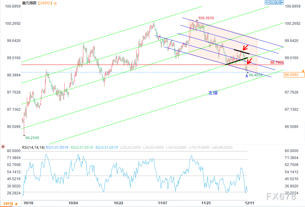 美元指数沿红色通道下轨进一步下行,若跌破下轨,价格或下探绿色通道下轨,该位置或将成为关键支撑位。