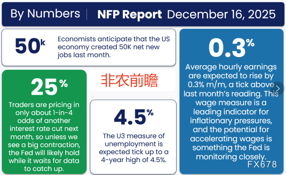 由于调查数据缺失,十月就业报告基本被错过(预计有限信息将随十一月就业数据一起发布),美联储将在制定2026年初货币政策路径时密切审视十一月数据。尽管如此,交易者目前仅定价四分之一概率在一月再次降息,这意味着除非劳动力市场出现大幅恶化,否则市场对本次发布的反应可能较为有限。
