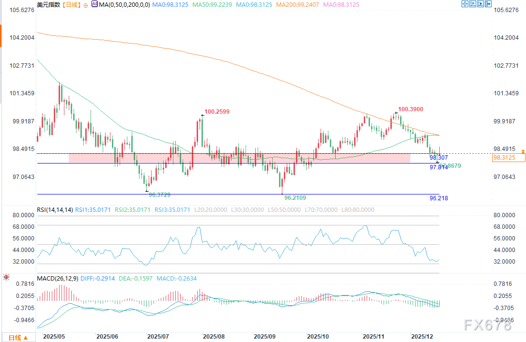 劳动力市场持续走软,且美联储可能在2026年初调整为宽松货币政策,多重因素令美元承压。若美元指数跌破98.307—97.814这一关键回撤区间,可能引发抛售潮,推动指数加速下探96.218。
