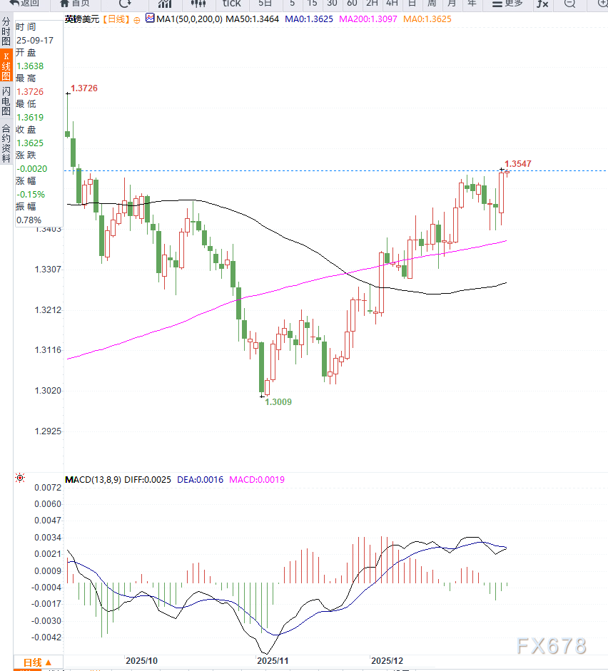 综合来看,英镑兑美元在高位出现小幅回调属于正常整理范畴。美元虽因避险需求获得阶段性支撑,但在降息预期压制下难以形成趋势性上涨;